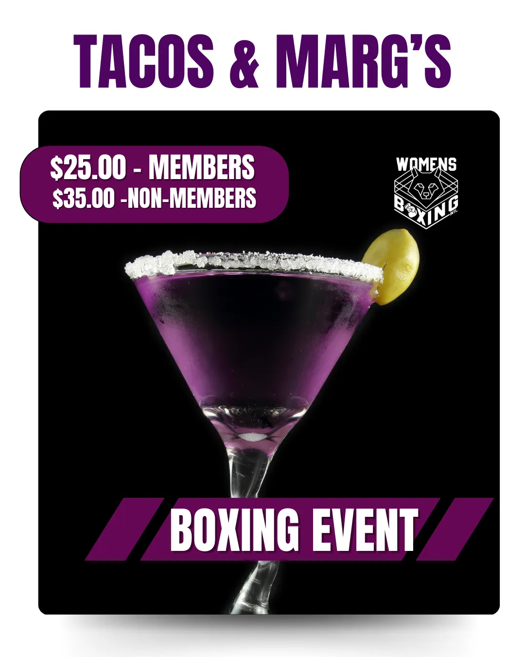 First, we’ll unite in the ring for some empowering boxing action. Afterward, we’ve arranged tables for everyone to relax, savor handcrafted tacos, and indulge in delicious margaritas!